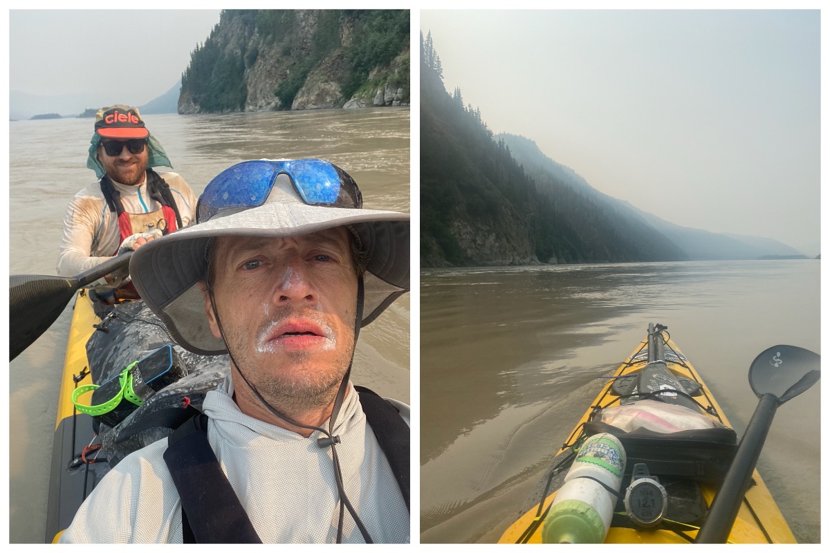 Day three we reached the end of my downloaded maps. Beyond Dawson City, the maps become more… interpretive. Then came wildfire smoke. Masks were required gear, but not compatible with “move fast and breathe hard,” so we ditched them and paddled through a ghost-world haze.